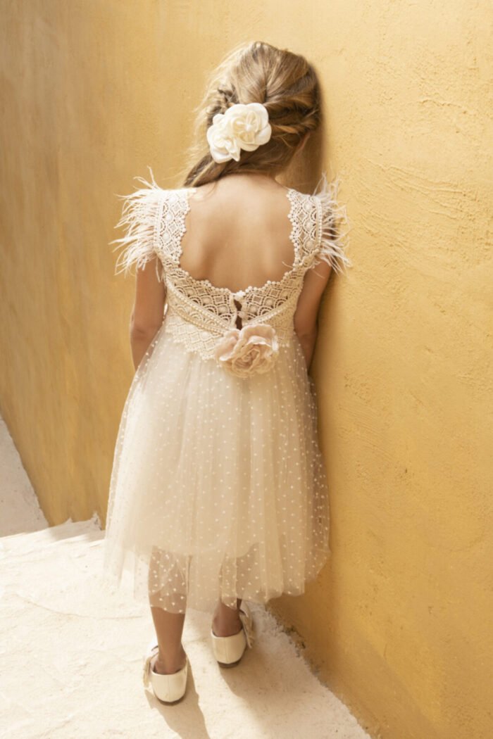 Πούπουλα maraboo στολίζουν τον ώμο του παιδιού , το εκπληκτικό αυτό αποτέλεσμα συμπληρώνουν τα χειροποίητα λουλούδια στην μέση και την πλάτη του φορέματος.